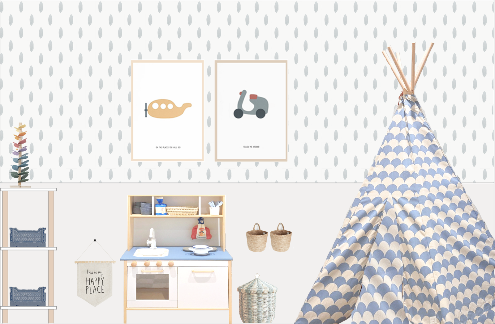 Aprovechamos los muebles existentes y los combinamos con decoración saludable y sostenible en tonos azules. Escogimos una alfombra de cuadros vichy, un vinilo de gotas y unas cajas de plástico reciclado en color azul.