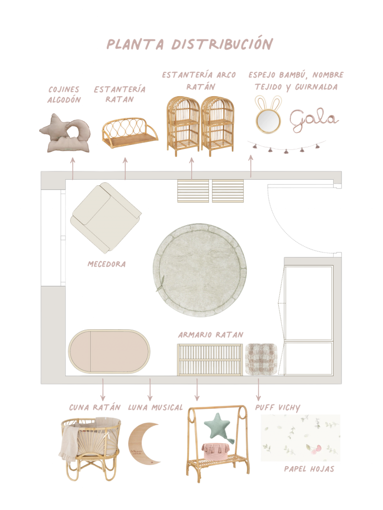 El proyecto consiste en diseñar un dormitorio para Jana, un bebé recién nacido. La família quiere colores suaves para conseguir un espacio acogedor y poca decoración. Les gustan los muebles en ratán y bambú y necesitan distribuir el espacio de manera funcional. Espacio para guardar ropa y pequeños juguetes.