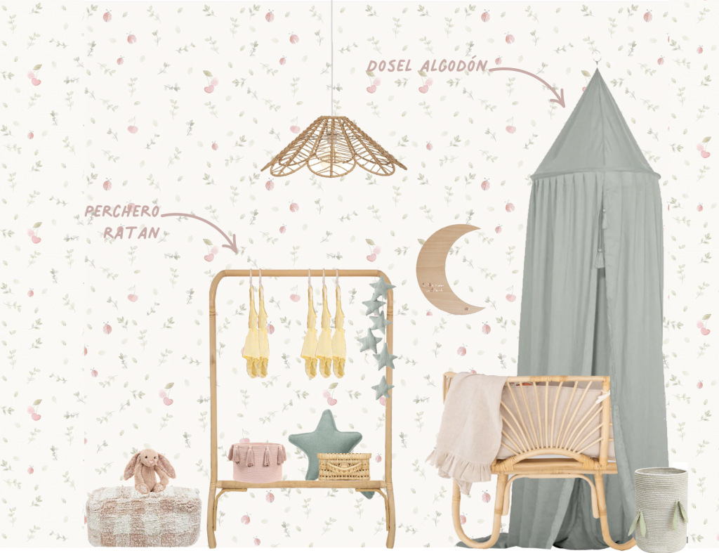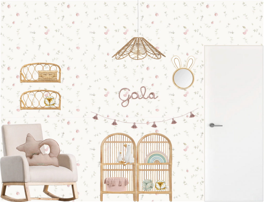 Decidimos combinar muebles de Ratan con complementos en tonos verde y rosa. El papel de pared de cerezas y mariquitas junto con el dosel y la alfombra se complementan para crear un diseño muy delicado y bonito. La habitación tiene un tamaño mediano y una forma rectangular, por lo que decidimos colocar en una misma pared la cuna y el perchero, y dejar la mecedora junto con la zona de juegos en la otra pared.