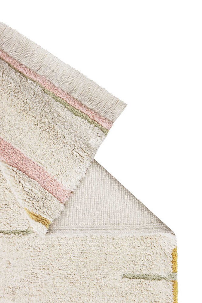Alfombra lavable rectangular en colores beige con rayas rosas, amarillas y verdes.